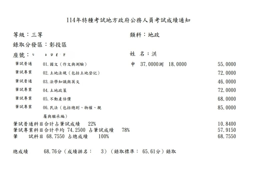 從112年下半年回鄉開始準備相關考試且為非本科生,課程報名以考取地政士證照為主,經紀人證照為輔的進行兩年半左右特別經驗的旅程,在113年不動產經紀人證照上岸後,114年地政士並未考取卻意外先上榜了114年普考增額並在今(115)年報到後尚在實務訓階段的菜鳥公務員。
