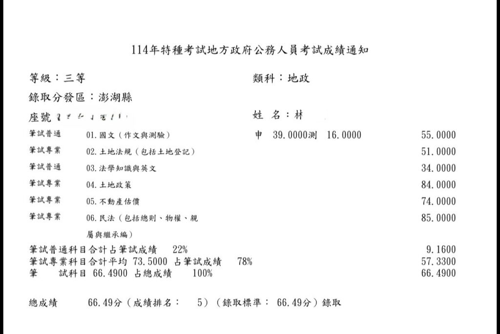 土地法的部分我花最多時間在於重測、重劃及徵收這三個部分,把課程看熟悉以及一直把老師後面的題目瘋狂練習,也因為老師說功力要花在後面題目上面,才讓我這次考試都會寫,真的超感恩又感動自己有聽老師的話。