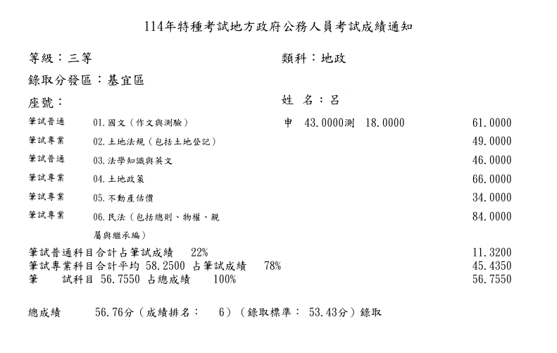 最後,謝謝我的家人及同仁鼓勵我去考地政公職,能考上114年地特三等地政真的很幸運,同時也祝福將來要考地政公職的考生都能金榜題名。